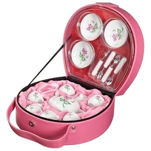 Product Description : From the ManufacturerThis adorable 17-piece porcelain tea set is packed in a durable pink vinyl carry-case. Set includes 2 1/2" tall tea pot with lid, four teaspoons, creamer and sugarbowl with lid. Set decorated with our exclusive patern. Dishwasher safe. Product Description : This adorable 17-piece porcelain tea set is packed in a durable pink vinyl carry-case. Set includes 4 1/2" tall tea pot with lid, four tea cups, four saucers, four teaspoons, creamer and sugar bowl with lid. Set decorated with our exclusive pattern. Dishwasher safe. Dimensions: Plates - 2 1/2", Cups - 1 3/4"w x 1"h, Sugar - 2 1/8"w x 2"h, Creamer - 1 3/4"w x 1 1/2"h, Teapot - 4 1/2"w x 3"h, Spoons - 3 1/4" L