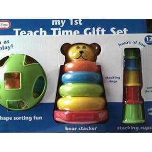 Product Description : My First Teach Time Gift Set includes a bear stacker with 5 colored rings, 5 pile up stacking cups and a shape sorting ball with many different shapes to provide baby with hours of fun and learning as they play.